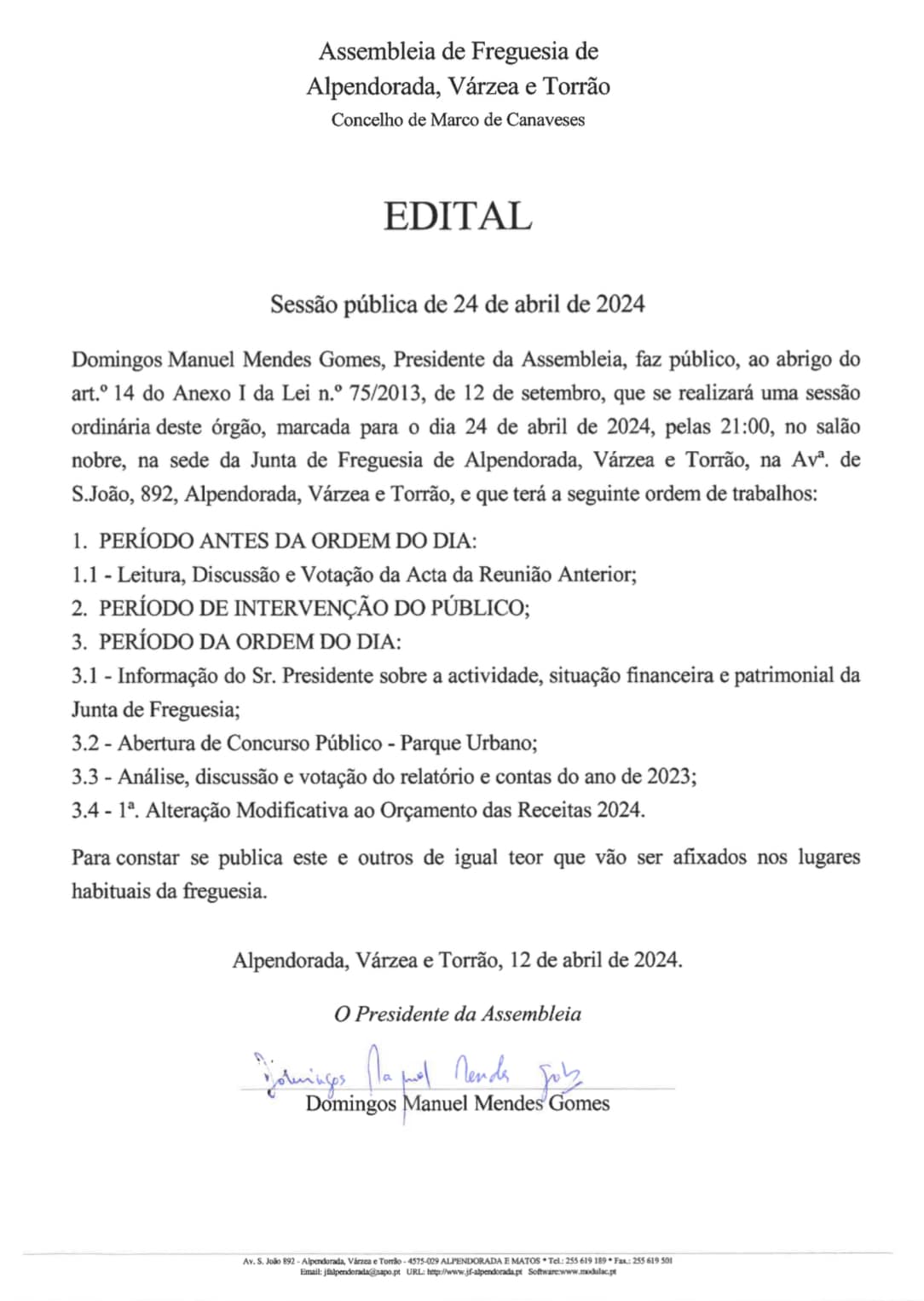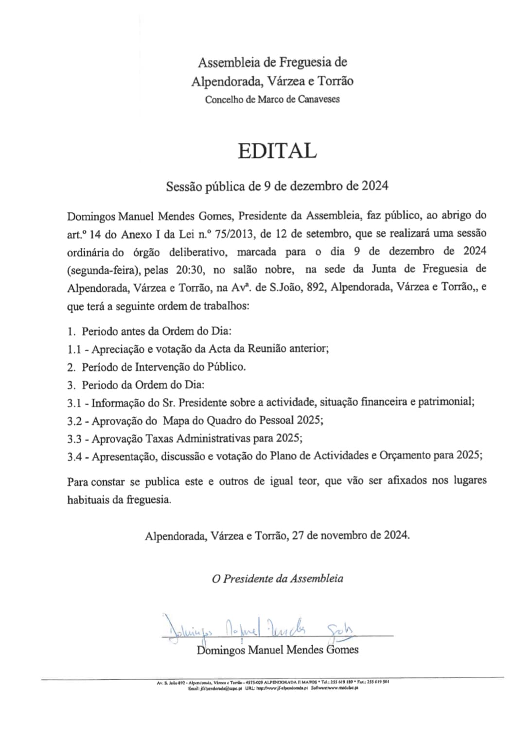 Edital Instalação da Assembleia de Freguesia de Alpendorada, Várzea e Torrão de 29 de outubro de 2025